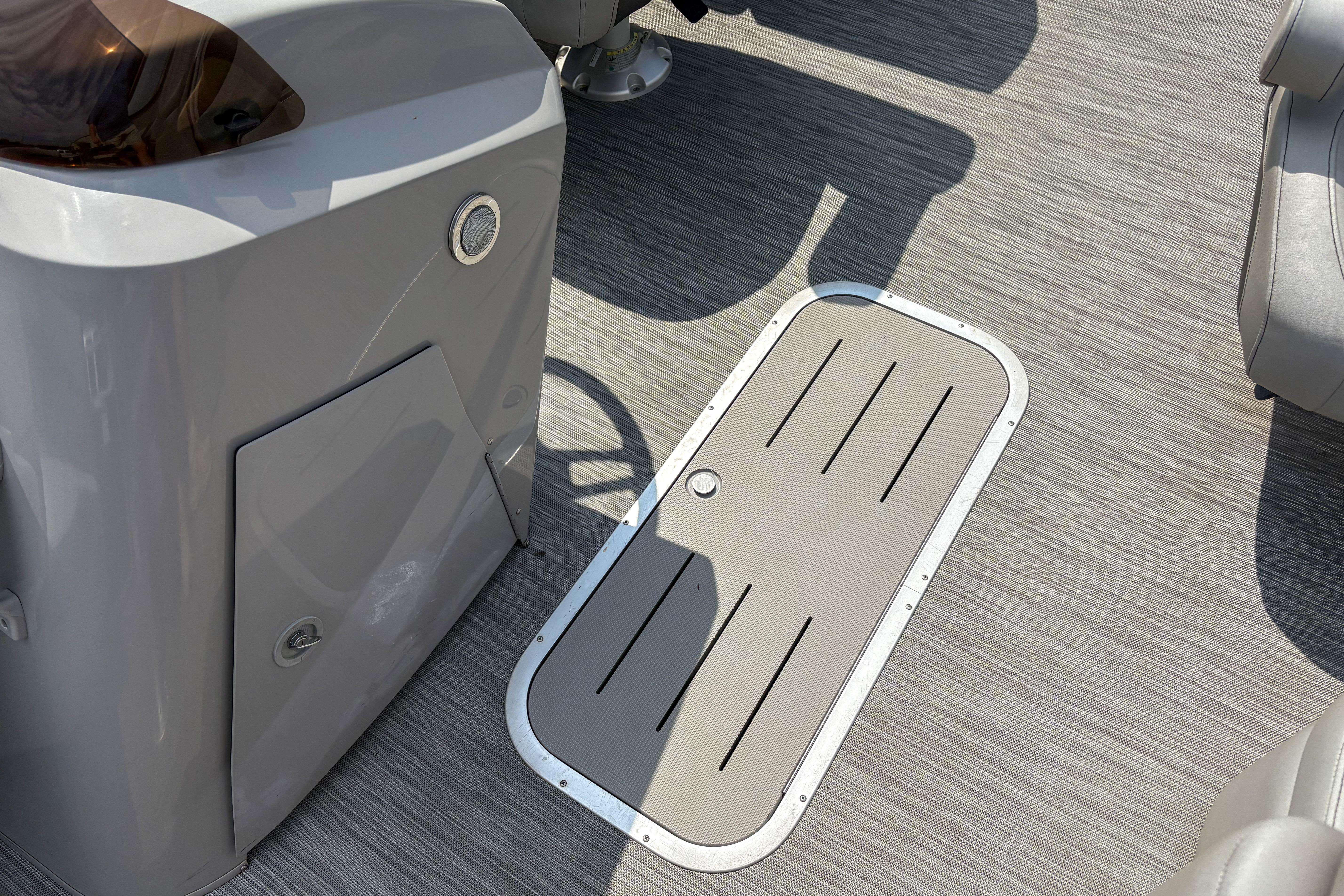 Stylish helm: reclining chair, custom gauges (fuel, tachometer, trim), low-profile windshield.